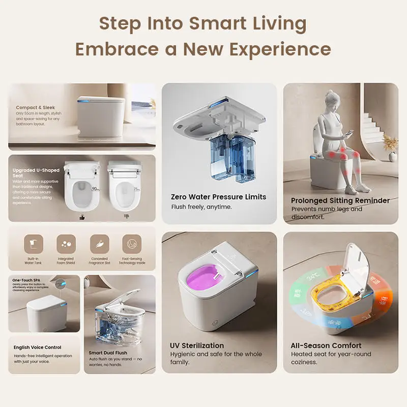 1. Automatic flush 2. foot sensor flush 3.seat induction 4. seat heating 5. mute slow down 6. night light 7. leakage protection 8. Energy saving 9. IPX4 waterproof 10. Flush during power failure |